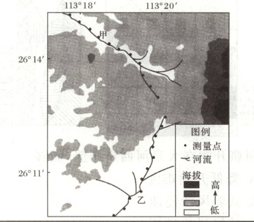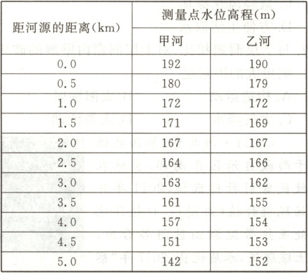 甲河与乙河发源于某山地两侧(如图)。某科研小组调研发现,甲河流经地区的岩石节理发育,压实和成岩作用相对较弱。下表示意两条河流河源段测量点的水位高程。