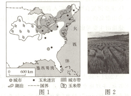 20世纪90年代,为应对国际粮食市场竞争加剧的冲击,美国某家庭农场因地制宜设计经营了首个“玉米迷宫”,通过趣味体验吸引游客,增加了农场收入。很快玉米迷宫就风靡北美。最初的玉米迷宫由农场主自行设计、栽种、维护和运营;随着地理信息技术的推广应用,农场经营玉米迷宫更加高效;现在北美经营玉米迷宫的部分家庭农场已发展为集农业生产、休闲娱乐、研学科普为一体的新型农场。图1为北美部分具有代表性的玉米迷宫分布示意图,图2为某玉米迷宫实景。