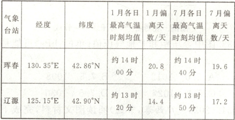(2023·全国乙卷)位于日本海附近的珲春与内陆的辽源各日最高气温时刻(北京时间)的月均值不同(如表)。规定各日最高气温时刻与月均值相差超过1小时为偏离。据此完成39题。