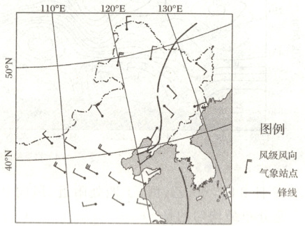 (2025·河北卷)2025年4月中旬,我国部分地区经历了一次大风天气过程。图示意期间某日14时的锋线位置和部分气象站点风级、风向。据此完成下题。