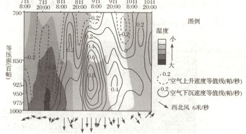 (2023·湖南卷)大气污染受湿度、大气运动等因素影响。我国某地某月7日8:00至10日20:00经历了一次较强的大气污染,PM2.5浓度变化大。此期间该地空气垂直运动弱。下图示意此期间该地相关气象要素的变化情况(箭头表示对应时刻的近地面风向和风速,帕/秒是气象部门计量空气垂直运动速度的单位)。据此完成40题。