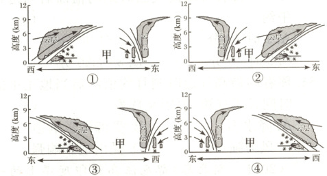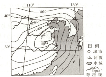 47.B 48.C [第47题,由题干“飞机尾部凝结的云带能较长时间存在”可知,飞机尾部凝结的云不容易扩散,所以处在逆温层之中,B正确;受强紫外线照射对飞机尾部凝结的云带的存在时间影响不大,A错误;强烈对流运动会加速云带的消失,C错误;受冷锋云系挤压,风力较大,云带易消失,D错误。 第48题,由图中等压线图,甲地位于995hPa低气压中心附近可知,此处是锋面气旋,甲地东侧为暖锋,西侧为冷锋,C正确,A、B、D错误。]