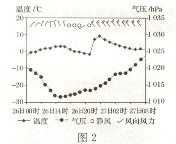 (2021·辽宁卷)某年11月,华北一气象站(位置见图1)测得锋面过境前后近地面气象要素的变化数据,如图2所示。据此完成45~46题。