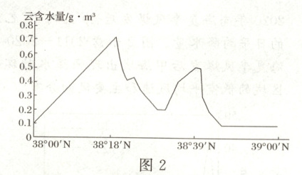 祁连山西部某山的雪线高度约为4600米。该地区云含水量(云中液态或固态水的含量)空间分布差异较大,空中水汽资源相对丰富,可为人工增雨(雪)作业提供良好的条件。图1为该山所在地区夏季多年平均降水量分布图。图2为遥感卫星探测的5000米高度处夏季平均云含水量纬度变化图。