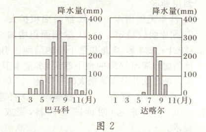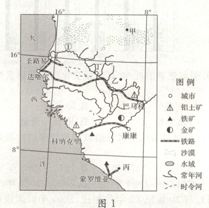 材料 图1为非洲部分区域略图,该区域矿产资源丰富,大部分矿产品通过海运出口。图2为图1中①河附近两测站年内降水分配图。