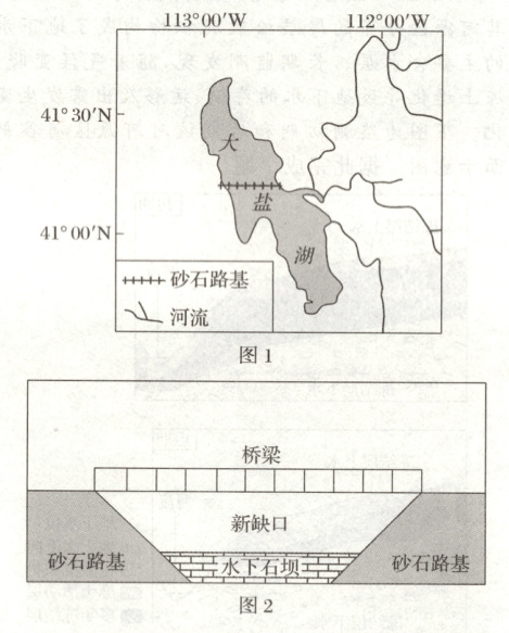 (2025·山东卷)美国大盐湖(图1)平均深度约4.3米,湖中只有卤虫等少数耐盐物种。研究表明,120‰~160‰的盐度可使大盐湖中卤虫种群维持较高的密度。20世纪初,湖上修建了一座跨湖木制铁路桥。该桥在1959年被一条新建的与其平行的砂石路基铁路取代。砂石路基将大盐湖分为北湾和南湾,并催生了两湾的特色产业——北湾的盐业和南湾的卤虫捕捞业。2013年,砂石路基仅有的两处4.6米宽的涵洞因老化被永久封闭。2016年,路基又被挖开一个55米宽的“新缺口”,并修建了桥梁和一道高度可调整的水下石坝(图2)。据此完成15题。