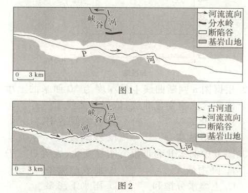 (2025·黑吉辽蒙卷)青藏高原某断陷谷地地势西高东低,海拔3470-3650米。距今1.8万年前,断陷谷中的P河沉积了深厚的松散物质。分水岭以北,L河源区发育了深切峡谷,河床海拔3280-3320米。距今1.8万年以来,L河通过溯源侵蚀切穿分水岭,在断陷谷内向上游持续延伸近80千米。此后,L河的支流X河开始发育。图1、图2分别示意距今1.8万年前和现代断陷谷及其周边地貌与水系格局。据此完成16题。