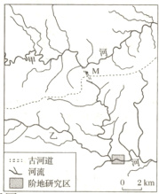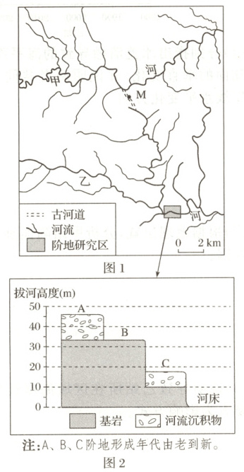 图1示意甲、乙两河的部分流域。约7万年前,该区域发生了河流袭夺。图2示意乙河阶地研究区的阶地剖面模式。