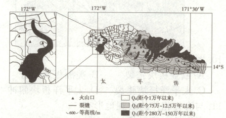 (3)简析乌波卢岛西部Q₁火山岩高岗形成的原因,并推断外力作用下其地形的演化。