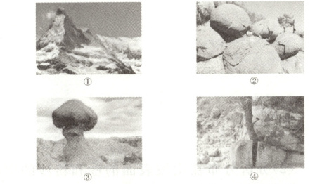 28.D [读图可知,①是角峰、刃脊,是冰川侵蚀地貌;②是花岗岩球状风化地貌;③是风蚀蘑菇,是风力侵蚀地貌;④是岩石裂隙,风化作用形成的。 因此②④正确,①③错误。 综上所述,D正确。]