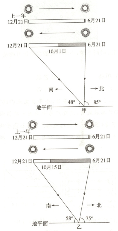 (2025·黑吉辽蒙卷)西高止山沿印度半岛西海岸分布,呈西北—东南走向。位于该山地的甲、乙两区土壤水分特征受气温、降水和坡向影响显著。下图示意从上一年12月21日到当年12月21日甲、乙两区不同日期正午太阳高度以及雨季(灰色)多年平均时长。据此完成1题。