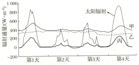 (2024·安徽卷)如图为我国某地面观测站(47°06′N,87°58′E,海拔561 m)某月1日前后连续4天太阳辐射、地面反射太阳辐射、地面长波辐射和大气逆辐射的通量逐小时观测结果。据此完成2题。