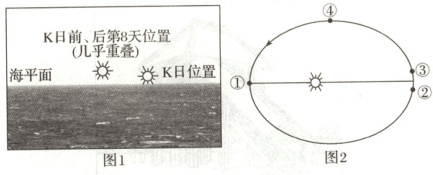 4.B 本题主要考查地球位置的判断。根据题目信息可知,拍摄太阳照片的时间为K日及其前、后第8天的同一时刻,并且图示K日前、后第八天太阳的位置几乎重叠,说明处于中间的K日是地球上太阳直射点移动方向的转折点,因此拍摄到这种现象的日期应是太阳直射南、北回归线时。由于拍摄的固定方位是西北方向,且太阳接近海平面,图1应为日落时段的太阳方位,根据日落西北可判定K日太阳直射北回归线,为夏至日。由图2可知,①处于近日点,为1月初,A错。②③之间的中间点对应的应为远日点7月初,结合地球公转方向可确定②为夏至日,应为K日地球的位置,B对,C错。④靠近秋分日,D错。