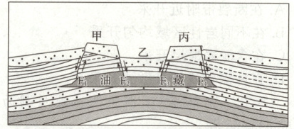 (2021·河北卷)下图为我国某盆地油藏地质剖面示意图。其中F₁~F₄为断层。在多次区域性水平挤压力作用下,大型背斜油藏受到构造甲、乙、丙的破坏,使石油组分大量散失。据此完成58~59题。