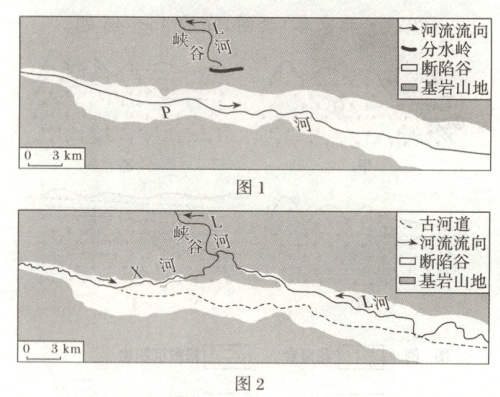 (2025·黑吉辽蒙卷)青藏高原某断陷谷地势西高东低,海拔3470-3650米。距今1.8万年前,断陷谷中的P河沉积了深厚的松散物质。分水岭以北,L河源区发育了深切峡谷,河床海拔3280-3320米。距今1.8万年以来,L河通过溯源侵蚀切穿分水岭,在断陷谷内向上游持续延伸近80千米。此后,L河的支流X河开始发育。图1、图2分别示意距今1.8万年前和现代断陷谷及其周边地貌与水系格局。据此完成63题。