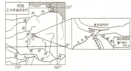 南美洲的卡西基亚雷河(以下简称“卡河”)是奥里诺科河(以下简称“奥河”)上游的一条汊河,经内格罗河流入亚马孙河(如图)。奥河在分汊口附近堆积有大量沉积物。自分汊口向下游方向,相比较而言,奥河河道宽而浅,卡河河道窄而深,卡河河床纵剖面坡度明显大于奥河。目前该分汊口上游约四分之一的来水流入到卡河,专家预测卡河未来将成为主要河道。