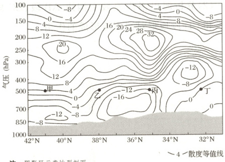 (2025·山东卷)风向或风速分布不均匀时,空气会发生辐合(或辐散)。散度是描述空气从周围向某一处汇合或从某一处向周围流散的程度量。某年10月17日~18日,G地经历了一次暴雪天气。图示意18日8时沿106°E经线(经过G地)的散度等值线垂直分布,散度大于0表示水平辐散,小于0表示水平辐合。据此完成1题。