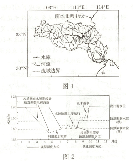 材料二 近年来,丹江口水库以《丹江口水利枢纽调度规程(试行)》为基础,主要从汛前水位消落、汛期水位控制、汛末蓄水三个方面进行优化调度的探索。2021年,基于精准的降水、洪水预报,丹江口水库在保证防洪安全的前提下,通过优化调度超额完成供水计划,并首次蓄水至设计蓄水位170m。图1示意汉江流域概况。图2示意优化调度方式与规程调度方式的对比。