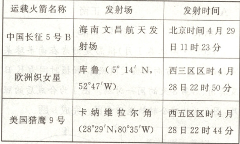 (2021·广东卷)据报道,北京时间2021年4月29日,包括我国搭载空间站天和核心舱的长征5号B等三枚运载火箭先后发射升空。三个发射场均位于海岸线附近。下表为三枚运载火箭发射的相关信息。据此完成11题。