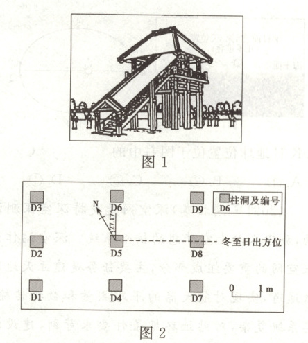 (2024·广东卷)距今约3000年前的金沙遗址(30°41′N,104°01′E)是古蜀国时期的一处大型聚落遗址。在该遗址祭祀区的东部,有一处九柱建筑基址,其9个柱洞呈“田”字形分布。研究发现,这些柱洞分布具有一定的天文属性。图1为九柱建筑的复原示意图;图2示意该建筑柱洞平面分布及当时冬至日的日出方位。据此完成12~13题。