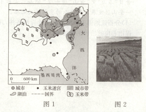 (1)问,本问可从玉米迷宫分布是否均匀、数量、范围、方位、特殊现象等角度分析。由图可知,玉米迷宫空间分布不均,数量较多,分布范围较广,主要位于美国东北部地区,主要分布在玉米带东部和城市带附近,且多靠近城市分布。根据玉米迷宫多分布于玉米带东部与城市带附近可知影响其分布的主导因素为原料充足与市场需求。从隐蔽性分析,迷宫需要隐蔽性较高,玉米的秸秆高度较高,可满足迷宫隐蔽性的需要。修建普通迷宫成本较高,将玉米用作修建材料,可降低迷宫修建的成本。玉米生长周期较长,使迷宫开放时间较长,游客可长时间体验此游戏。玉米生长高度较为一致,总体整洁美观,游客体验较好。玉米多生长在乡间,使游客有亲近自然、回归乡野的身心体验,满足城市游客的休闲娱乐需求。