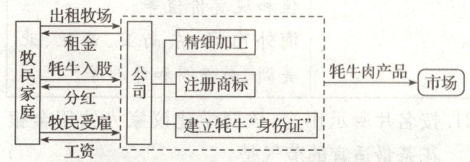 (2022·全国乙卷)当雄是拉萨唯一的纯牧业县,牧民占比约90%,依托特色畜种牦牛,走产业扶贫之路。甲公司成立于2017年初,采取“公司+农户”的模式(图),生产的有“身份证”的牦牛肉产品销往全国各地,广受消费者欢迎。据此完成26~28题。