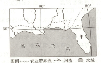 (2021·浙江6月)美国农业生产地区专门化特征明显,下图为美国农业带分布局部图。完成41~42题。