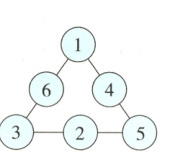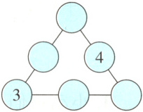 6.将1、2、5、6四个数字填入右面的$◯$里,使每条线上的三个数相加都是10。