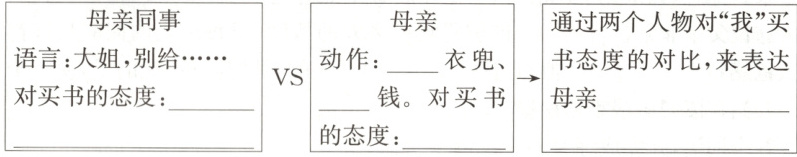 2. 找出并体会母亲和工友对“我”要钱买书不同的表现,填写下面的表格。