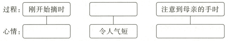 (1)段中写了“我”跟着母亲摘绿豆荚的过程和心情变化,请根据提示完成下列图表。(3分)