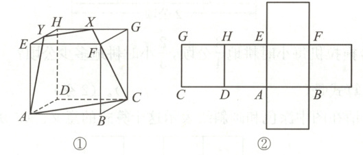 14. [新素养 空间观念]图①是正方体,四边形$ACXY$是表示用平面截正方体的截面,截面的边在展开图的哪里呢?把截面$ACXY$四条边的大致位置在图②的展开图里画出来。(4分)