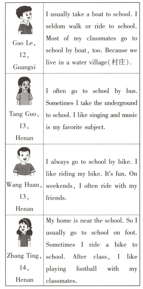 1.C 由表格第一栏第一句可知,高乐通常乘船去上学。