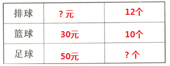 1. 李老师带的钱正好能买12个排球或10个篮球。每个排球多少元?李老师带的钱能买多少个足球?(填写表格并列式解答)(6分)