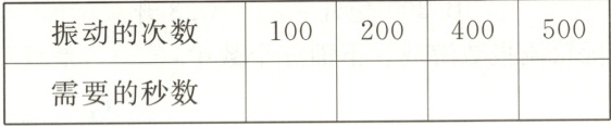 1. 蝗虫飞行时翅膀每秒振动20次,振动100次需要几秒?如果蝗虫翅膀分别振动200次、400次、500次呢?把下面的表格填写完整。(3分)