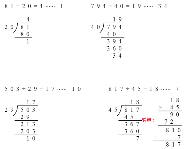 $81 ÷ 20 =$ $794 ÷ 40 =$ $503 ÷ 29 =$ ★$817 ÷ 45 =$