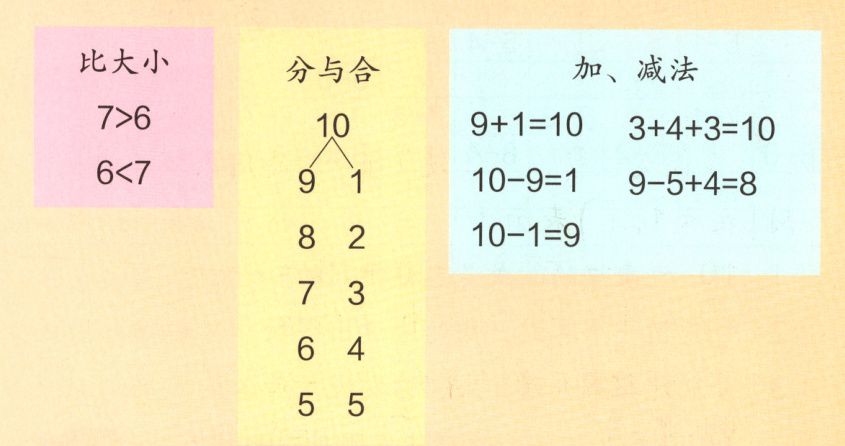 3. 分与合:10可以分成9和1、8和2、7和3、6和4、5和5。