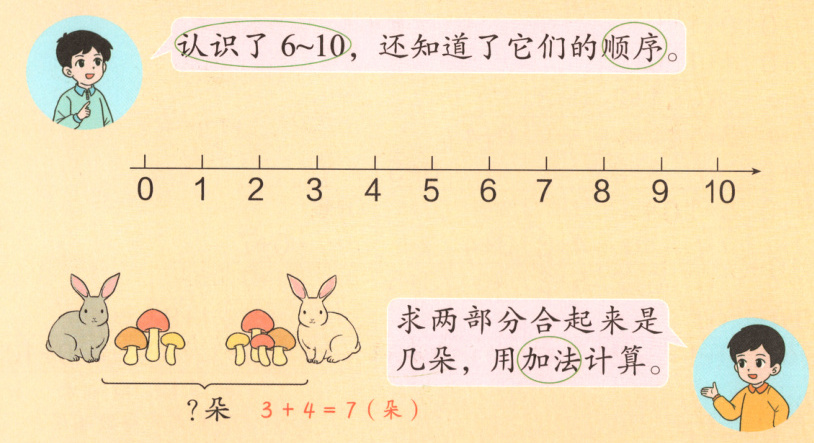 5. 求两部分合起来是多少,用加法计算,如3+4=7。