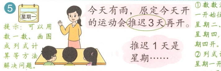 5 今天有雨,原定今天开的运动会推迟3天再开。推迟后,运动会星期几开?