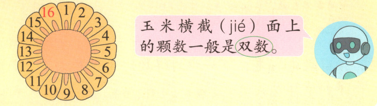 像2、4、6、8……这样的数叫双数,像1、3、5、7……这样的数叫单数。找几个玉米数一数,看看能发现什么规律?