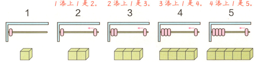 1添上1是2。 2添上1是3。 3添上1是4。 4添上1是5。