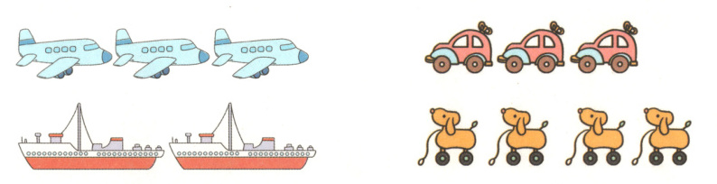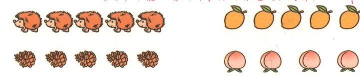 注意:用一一对应的方法比较两种事物的多少,不能只看两种事物的首尾是否对齐。解题指导 运用一一对应的方法比一比。第一幅图,玩具飞机有剩余,玩具小船没有剩余,因此3>2。第二幅图,玩具小狗有剩余,玩具小汽车没有剩余,因此3<4。第三幅图,刺猬和松果都没有剩余,因此5=5。第四幅图,柠檬有剩余,桃没有剩余,因此5>4。正确解答