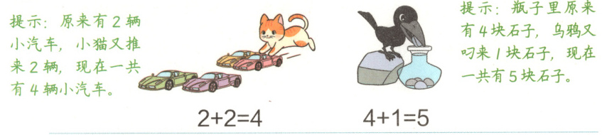 原来有2辆小汽车,小猫又推来2辆,现在一共有4辆小汽车。