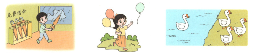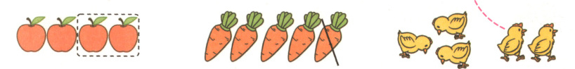 解题指导 第一幅图,一共有4个苹果,用虚线圈起来2个,表示减去2。第二幅图,一共有5根胡萝卜,用线画去1根,表示减去1。第三幅图,一共有5只小鸡,走了2只,表示减去2。第四幅图,一共有4把雨伞,借走了1把,表示减去1。第五幅图,一共有3个气球,飞走了1个,表示减去1。第六幅图,一共有4只鹅,走了3只,表示减去3。