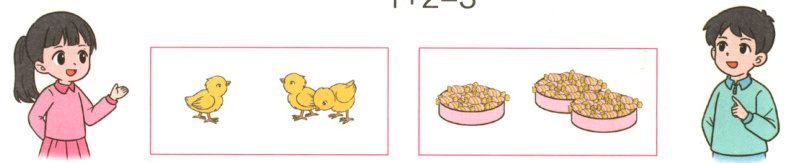 原来有1只小鸡,又来了2只小鸡,一共有3只小鸡。(其他算式可参考此例)