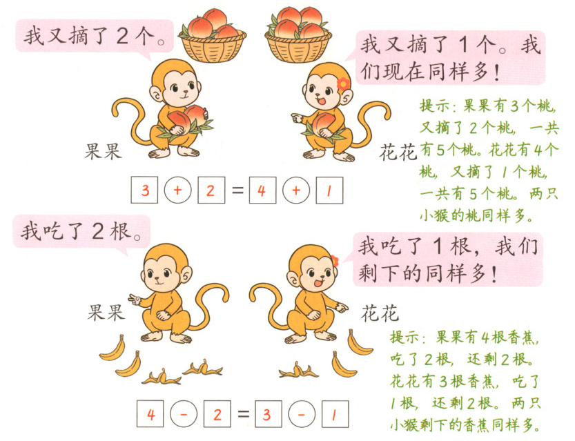 提示:果果有3个桃,又摘了2个桃,一共5个桃。花花有4个桃,又摘了1个桃,一共有5个桃。两只小猴的桃同样多。