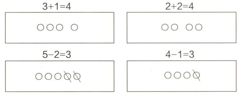 计算4-1时,先画4个○,再画去或用虚线圈出减掉的1个○,还剩3个○,因此4-1=3。