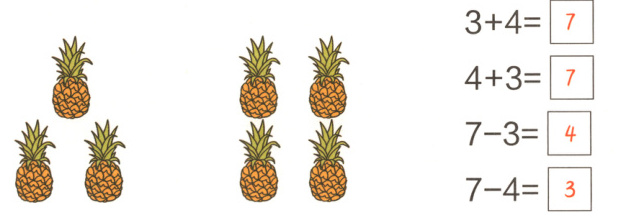 点拨:一般情况下,同一幅图,从不同的角度观察,可以列出两个加法算式和两个减法算式,称为一图四式。