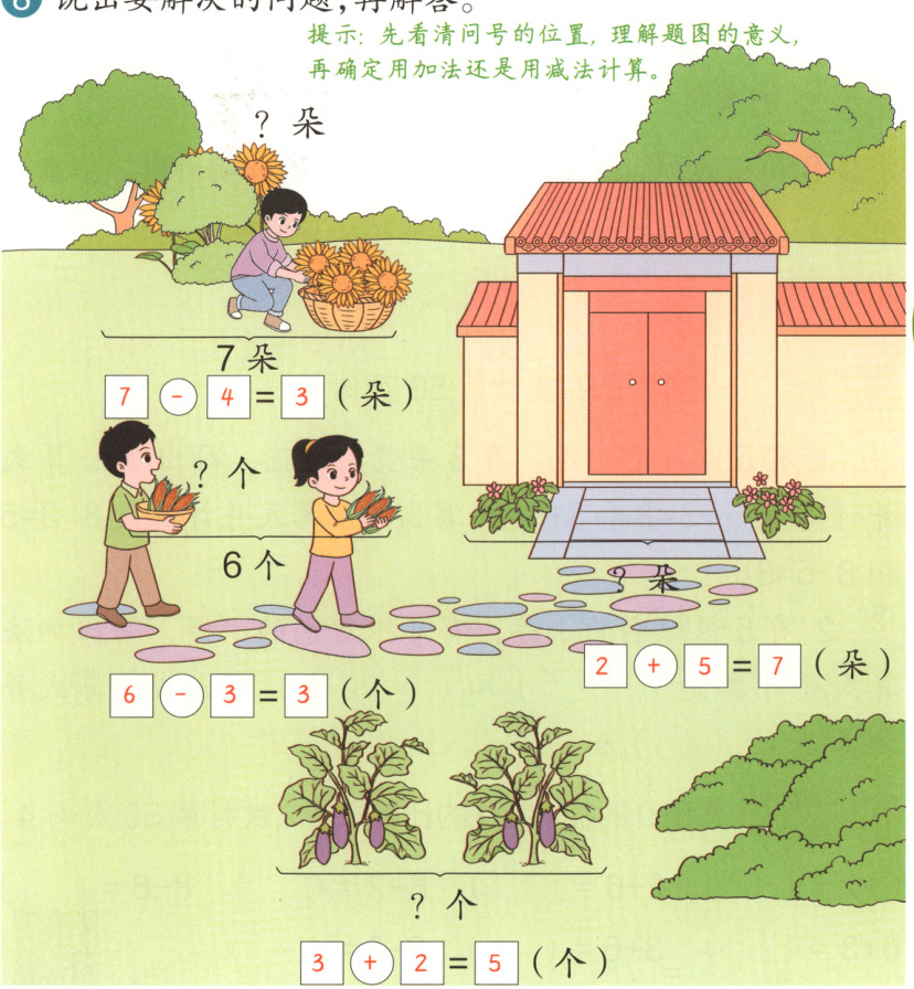 8 说出要解决的问题,再解答。 提示:先看清问号的位置,理解题图的意义,再确定用加法还是用减法计算。