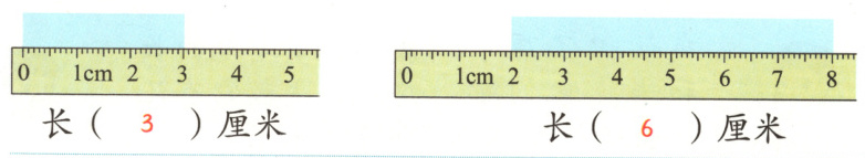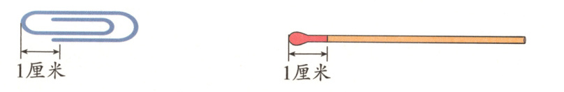第二个物体:以1厘米为标准估量单位,观察物体一端与0厘米刻度对齐,另一端约对准6厘米刻度处,所以约(6)厘米。