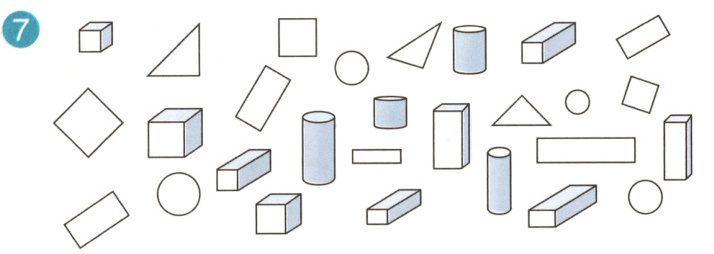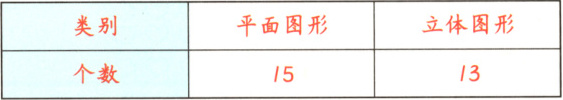 还可以按形状继续分。平面图形有圆、三角形、长方形和正方形,其中圆有 4 个,三角形有 3 个,长方形有 5 个,正方形有 3 个;立体图形有正方体、长方体和圆柱,其中正方体有 3 个,长方体有 6 个,圆柱有 4 个。(答案不唯一)